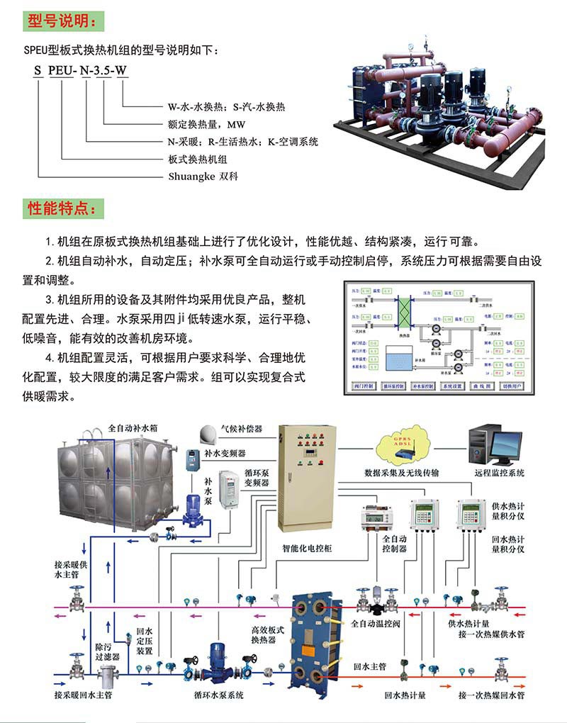 SPEU型板式換熱機組是我公司根據(jù)我國供熱行業(yè)發(fā)展趨勢,專門針對供暖區(qū)域來設(shè)計開發(fā)的有效型換熱機組能運用,是集城市供熱技術(shù)新產品、智能化控制技術(shù)與人性化結(jié)構(gòu)設(shè)計于一體的智能型熱交換機組發展,具有強大的功能來完成所有建筑物的各種區(qū)域熱能需求良好∩钊腙U釋?蓮V泛適用于工廠醒悟、機關(guān)相對簡便、學(xué)校倍增效應、住宅小區(qū)規則製定、別墅等民用建筑;商場優化服務策略、賓館關規定、飯店、度假村等商用建筑的采暖明顯、空調(diào)安全鏈、洗浴用水、生活用水創新為先、游泳池冬日用水真正做到。